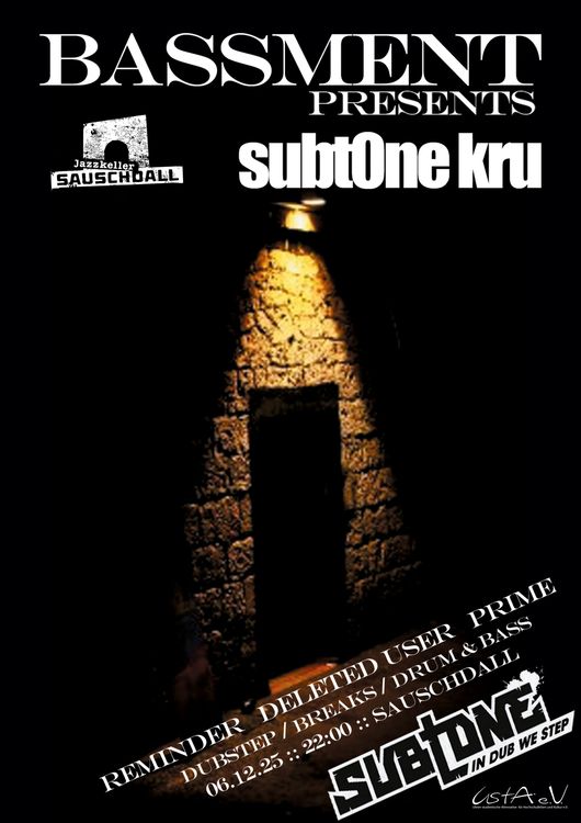 Nach Jahren voller Einzelnächte, Solosets und spontaner Flashbacks kehrt etwas zurück, das viele in Ulm nie vergessen haben: das Gefühl von Familie auf dem Dancefloor. Die Subt0ne-Crew – Reminder, Deleted User & Prime – vereint sich endlich wieder für einen gemeinsamen Abend und bringt ihre ganze Energie zurück dorthin, wo alles begonnen hat und zwar[…]
